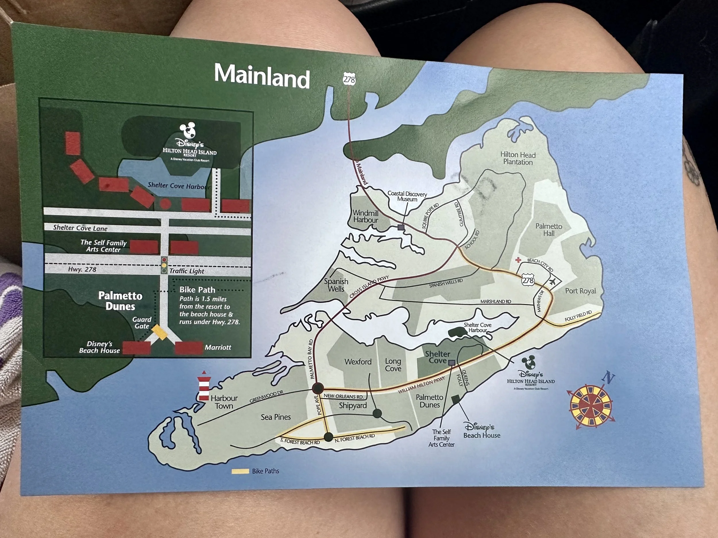 If you are not a guest of the resort, you will have to park in the Shelter Cove parking area and walk over to the property. You will pass the massive Disney’s Hilton Head Island Resort sign and there will be a lovely walkway to the left that you can either walk or bike in to get onto the property to avoid automobile traffic for safety. See the photos below.