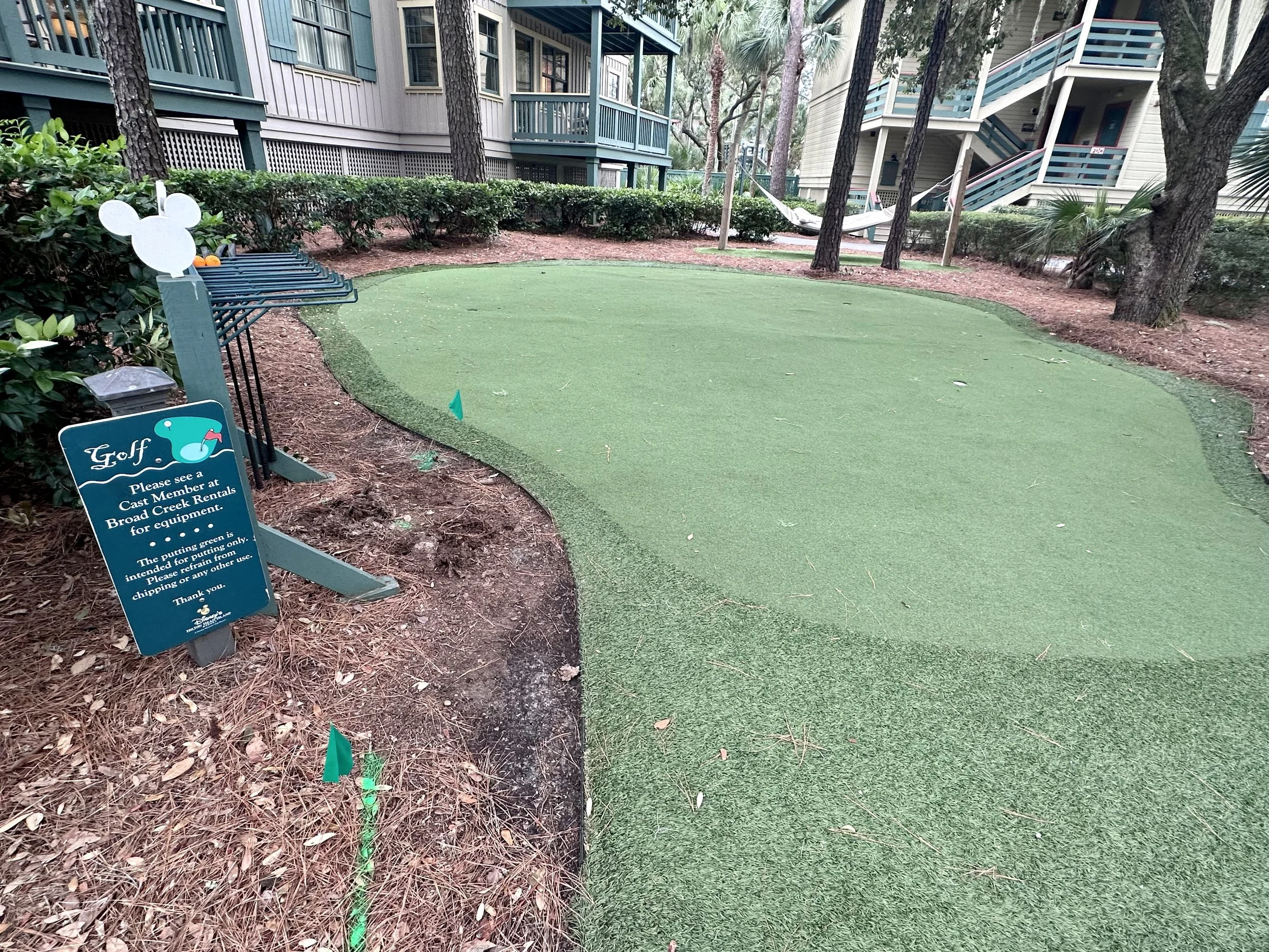 Here is a mini putting green with clubs and balls ready for use. You can also see a hammock in the background just begging for someone to lay down and relax.