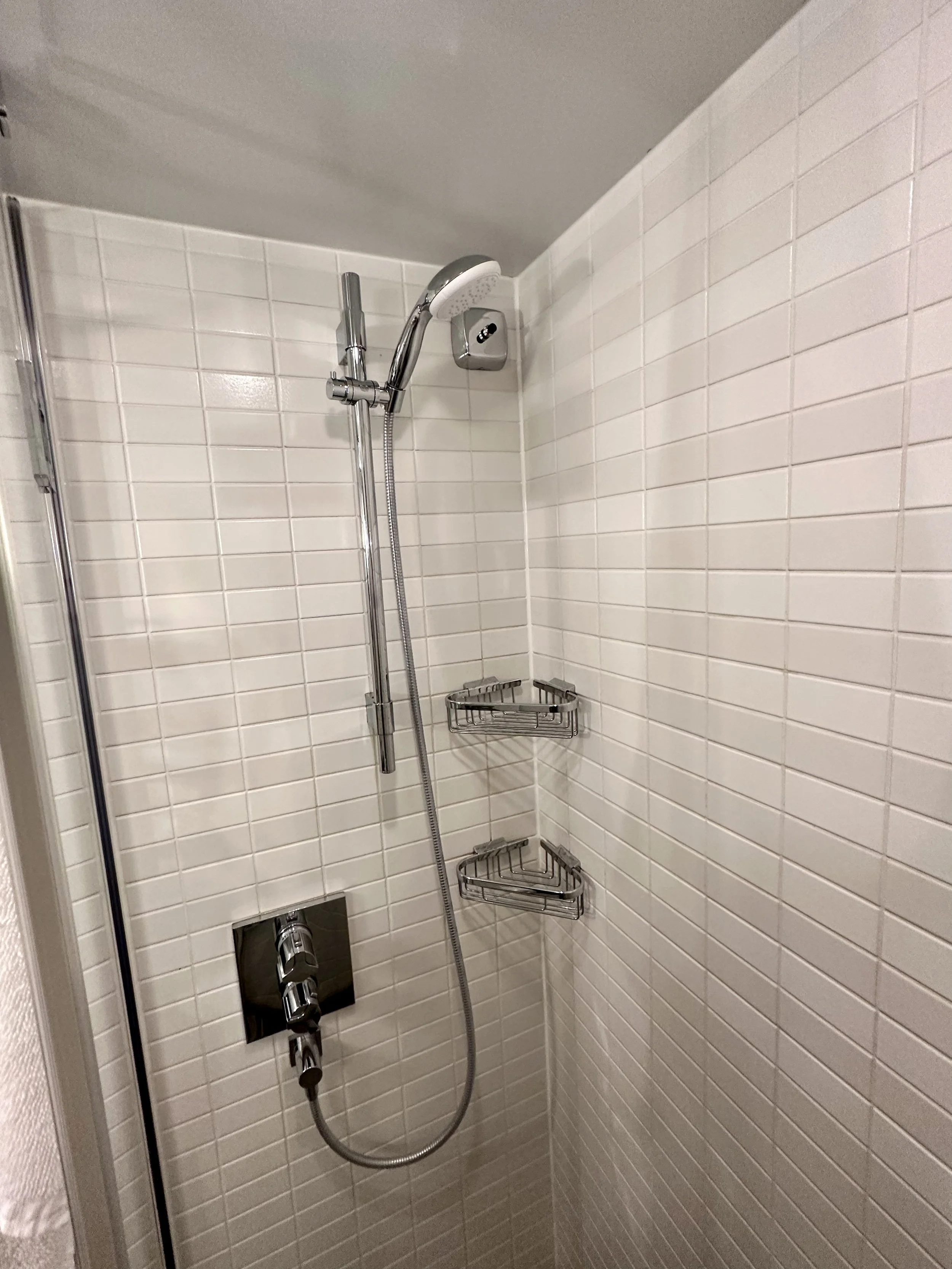 Inside the shower there were three little metal shelves for storage. There is also a line that you can pull and secure to utilize if you wash any of your clothing in your room and wish to dry it on the line. The shower head was removeable, the water pressure was better than at home, and the water got SUPER hot SUPER fast. I was honestly really impressed. I was also impressed that the floor never flooded or puddled.
