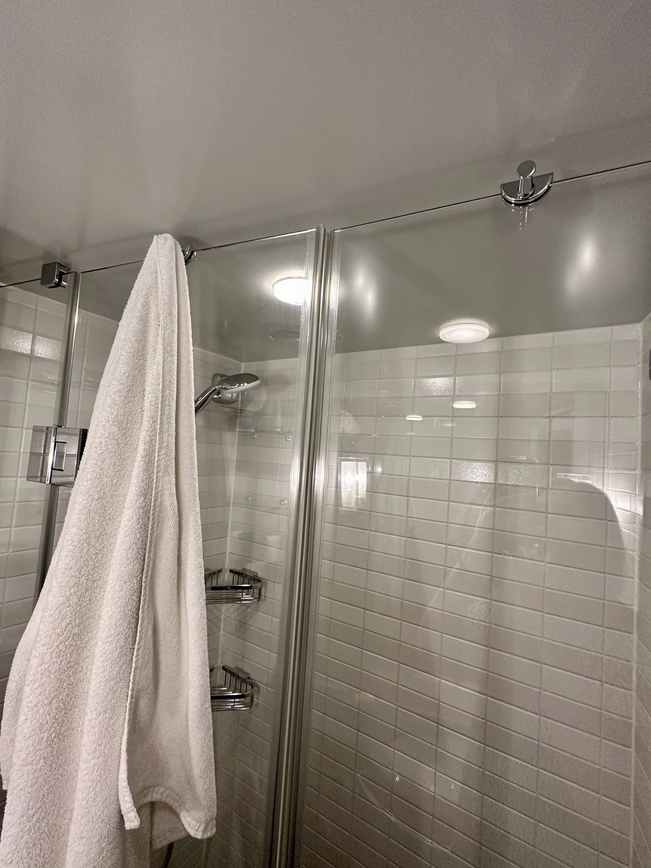 There were towel hooks on each side of the shower doors. The doors could swing in or out to make it easy to move around inside the shower and the bathroom.