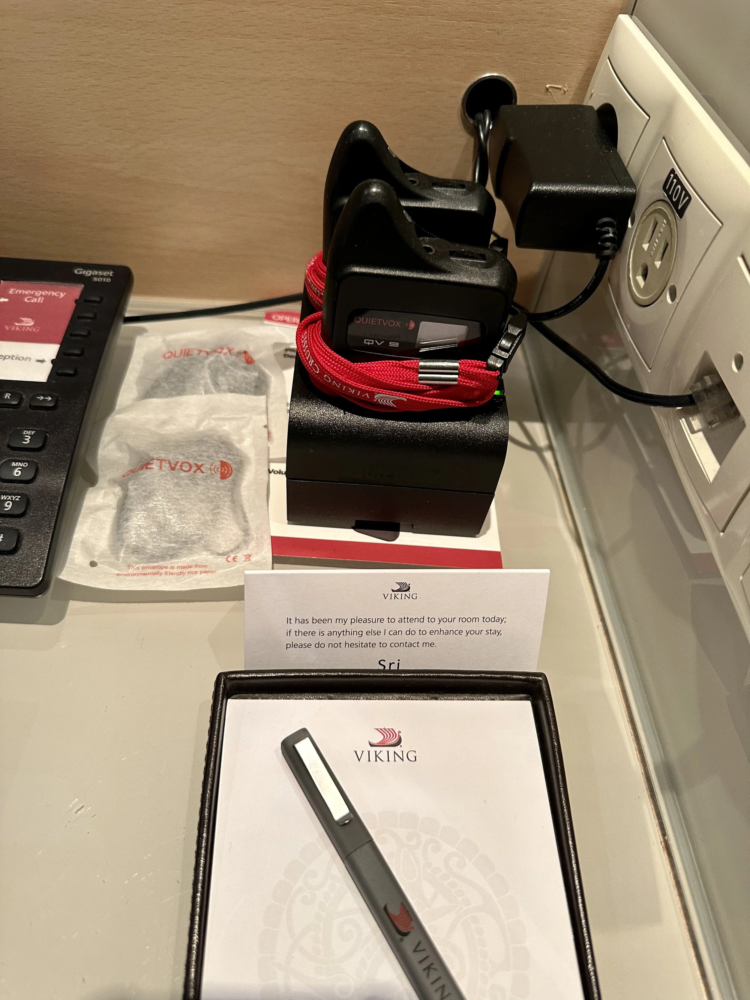 On the main counter space in the main area of the room, Viking provided a pen and paper pad, a TV remote, a phone, some European and US outlets, and our rechargeable listening devices.