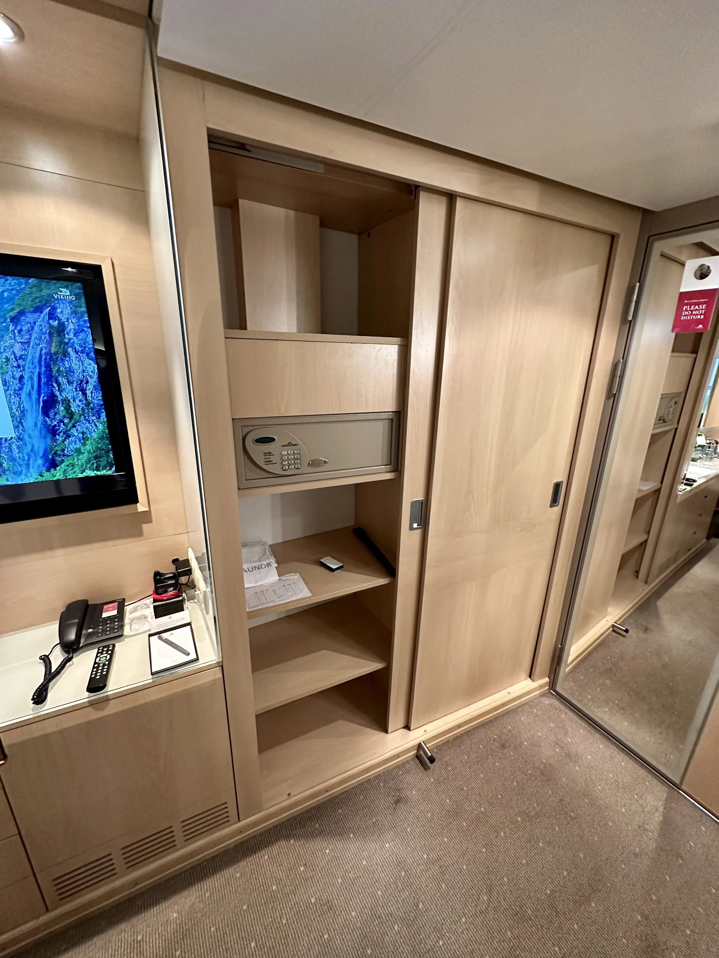 This photo is from my bed and shows the mini fridge to the far left, the TV above it, the closet (which has a sliding door), the exit door (which has a full-length mirror covering it) and the safe inside the closet. The safe was huge as far as closet safes go. Inside the closet there was also a wooden shoehorn, a laundry bag and pricing (if you wanted to pay to have anything laundered) and 4 deep shelves.