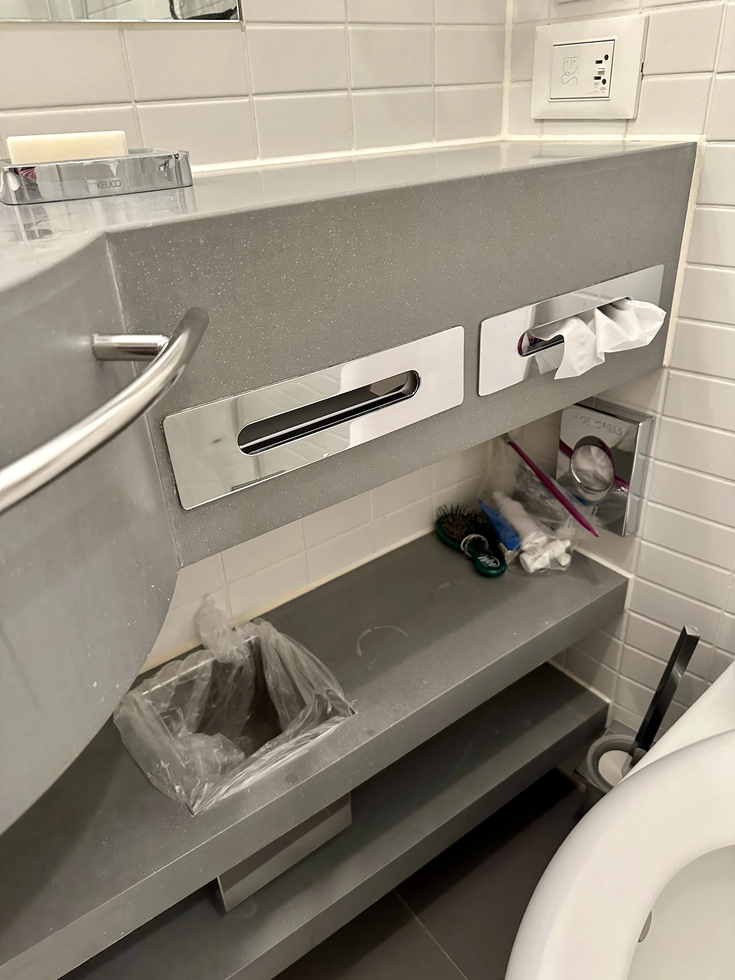 Under the sink there were two shelves that you could also use as storage. One contained the trash can. The toilet paper and Kleenex were stored inside the shelve to save space.