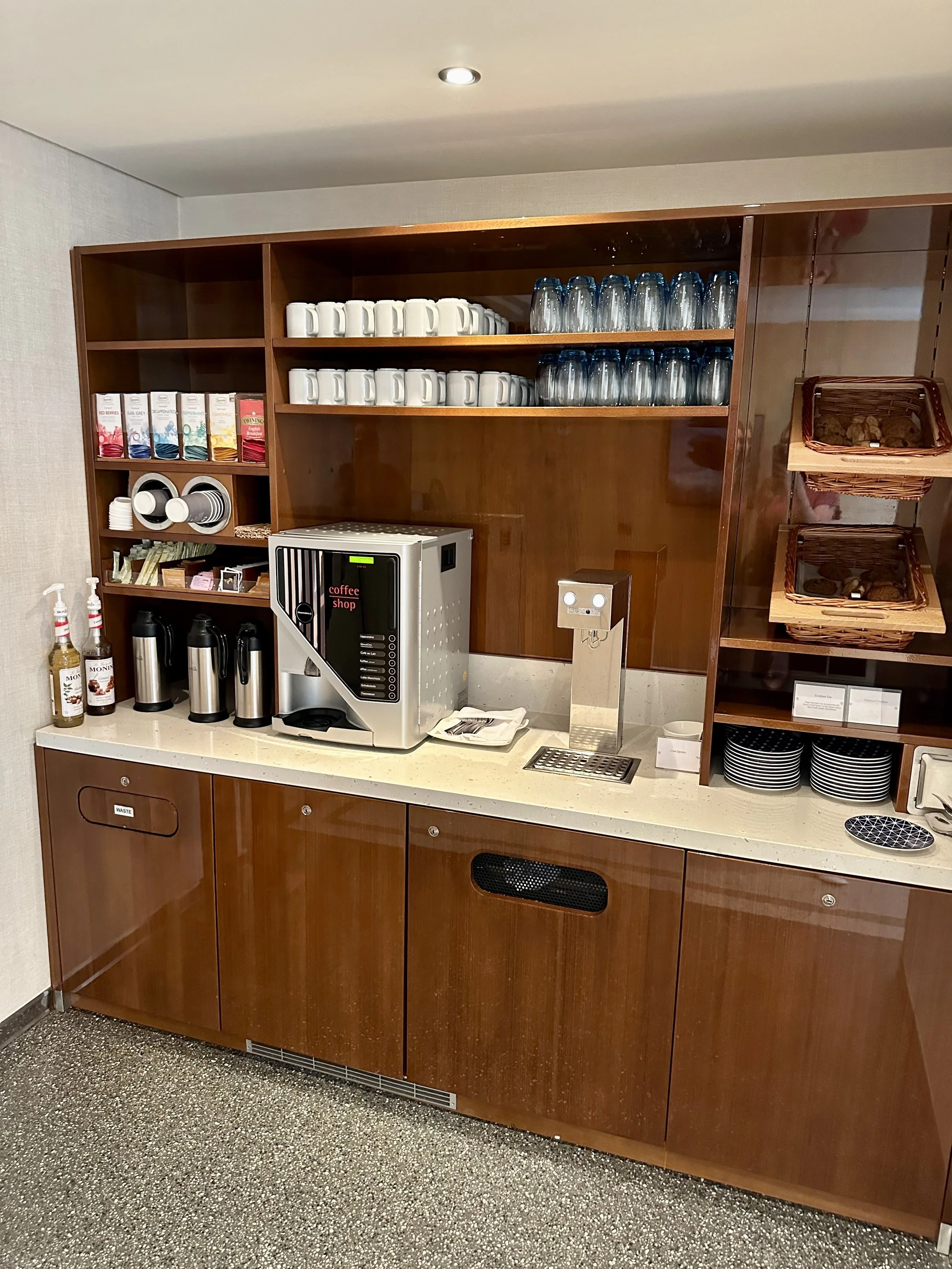 The coffee station was open 24 hours a day. They had several coffee options for you to choose from as well as a variety of milk, syrups, sugars, and tea choices. In the morning they had fresh pastries and muffins, and, in the afternoon, they rotated different freshly baked cookies that were available all day and night. They had glass coffee cups or paper ones so that you could either lounge with your beverage or take it away.