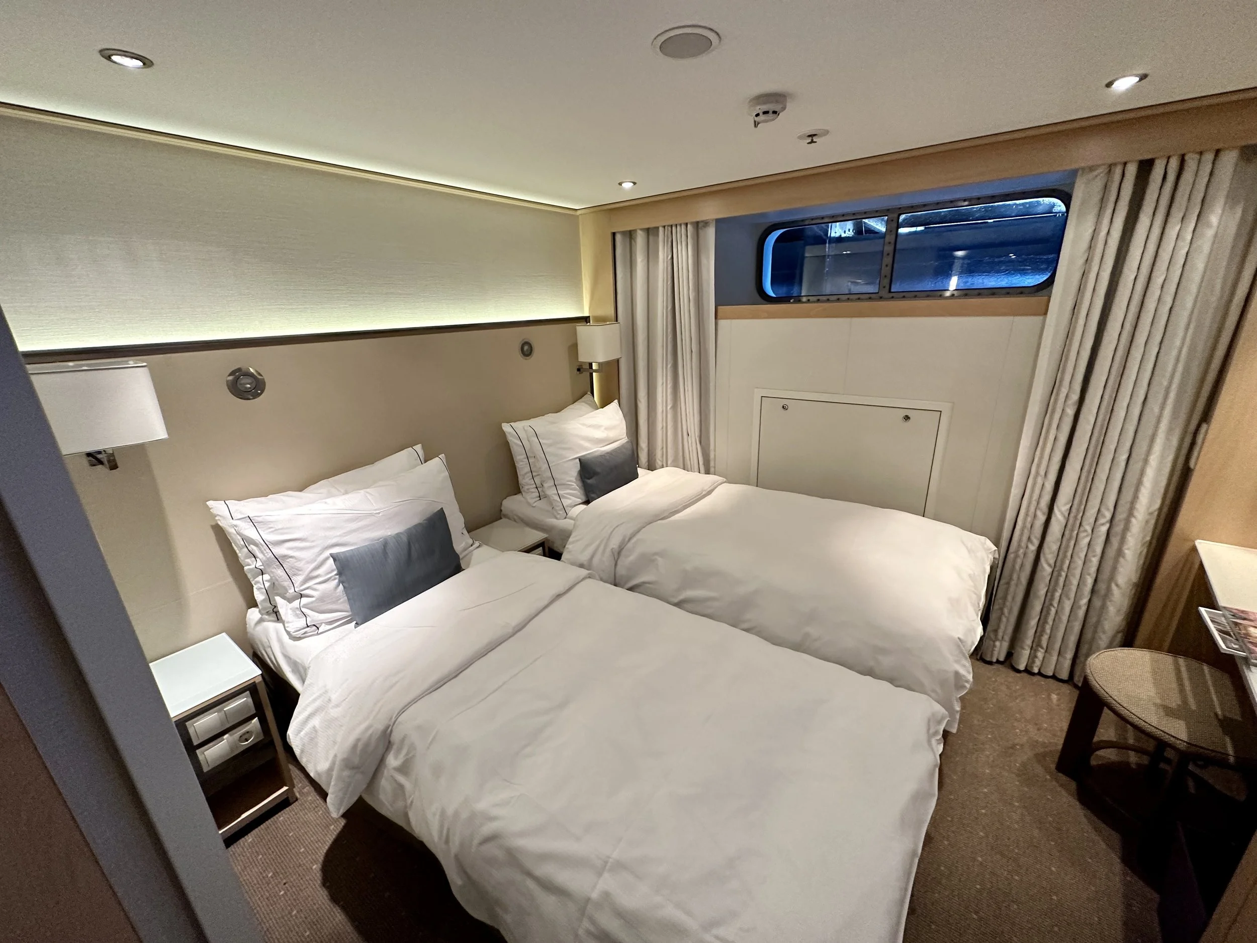 This photo is from in front of the closet and shows you the two beds, nightstands, bedside lights, window, and the vanity to the far right. We stored our luggage under our beds (our life vests were also stored there). The nightstands each had one European plug as well as a storage space at the bottom and a pull out that you could use as a flat surface. The curtains were blackout curtains and we pulled them all the way over the window at night, so we had pitch black for sleepy time. The beds were extremely comfortable, and we honestly had nothing to complain about when it came to the room.